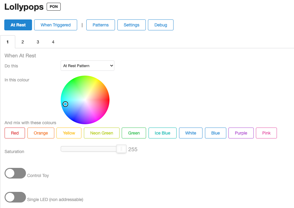 We thought we’d crank things up a notch. Lollypops shows a pattern when your pop bumper is ‘at rest’, and then different pattern when it is hit. Best of all, the colours and patterns are all 100% configurable over Wifi, giving you infinite flexibility over how your game looks and behaves.