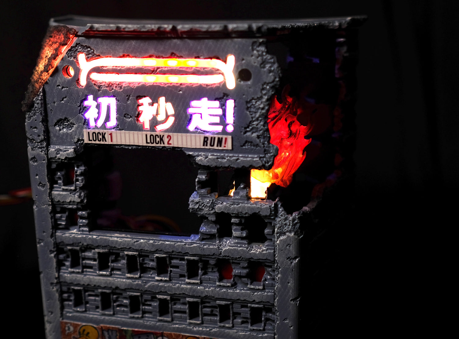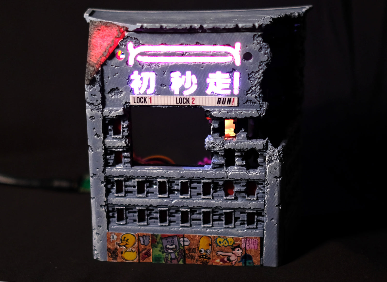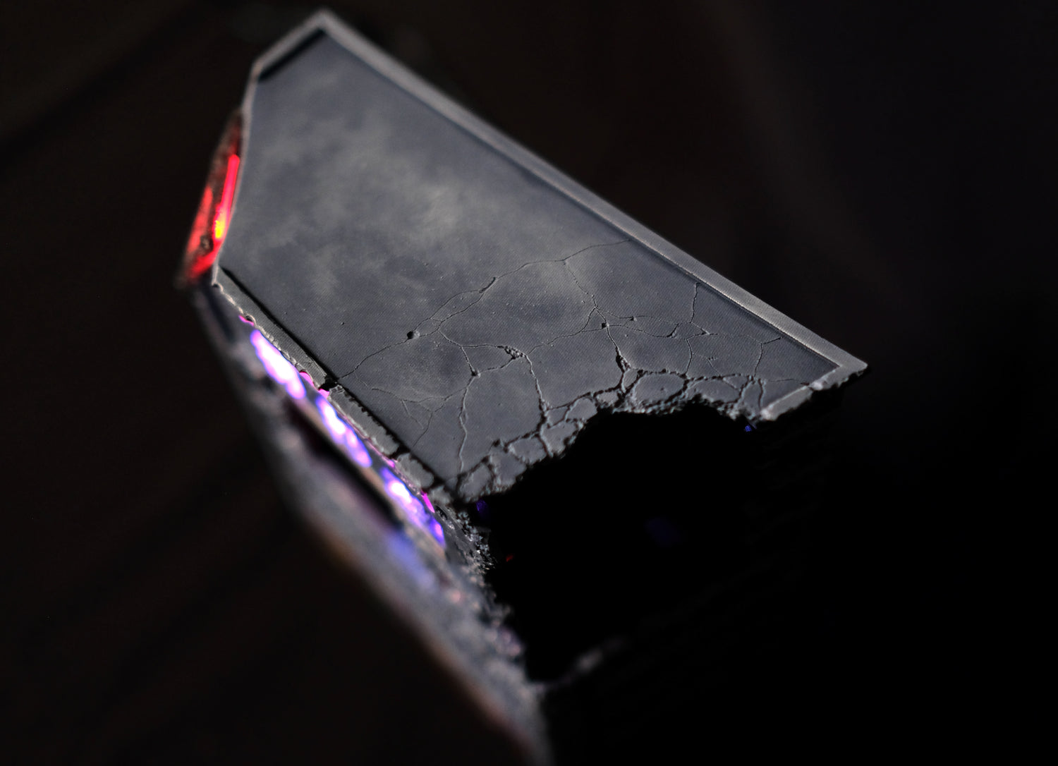 Also, you’ll be able to see some print lines in the collapsing wall section. This was again due to time constraints. We FDM printed it, but for production it will the usual quality, with some edge highlighting to make it stand out a bit more.