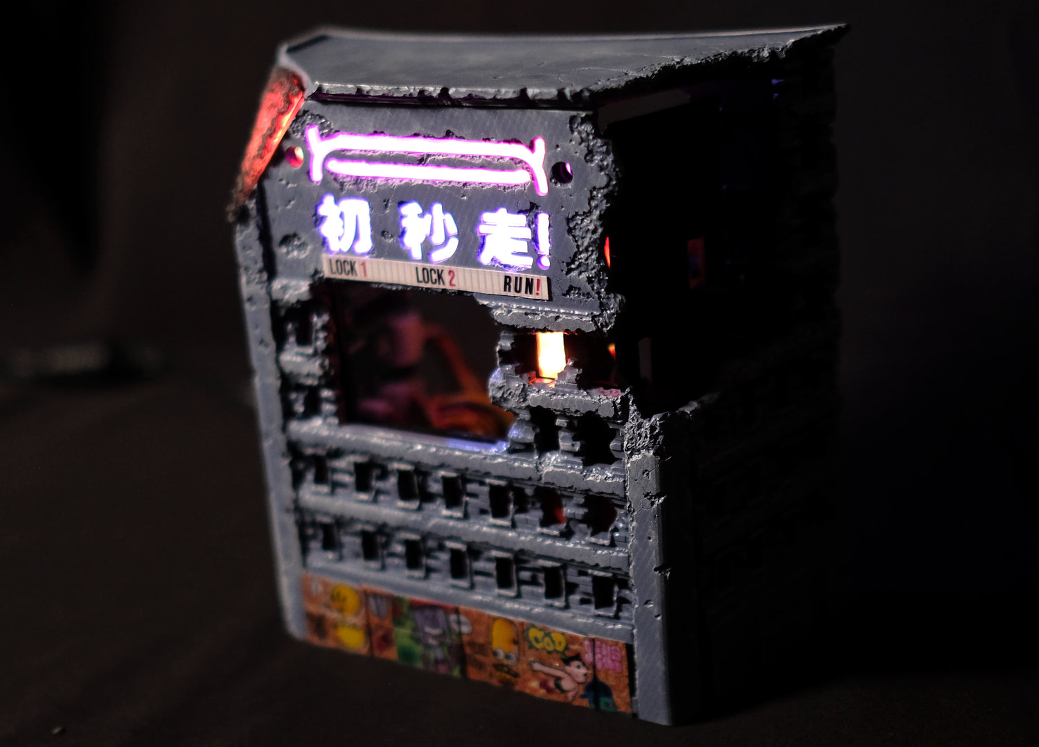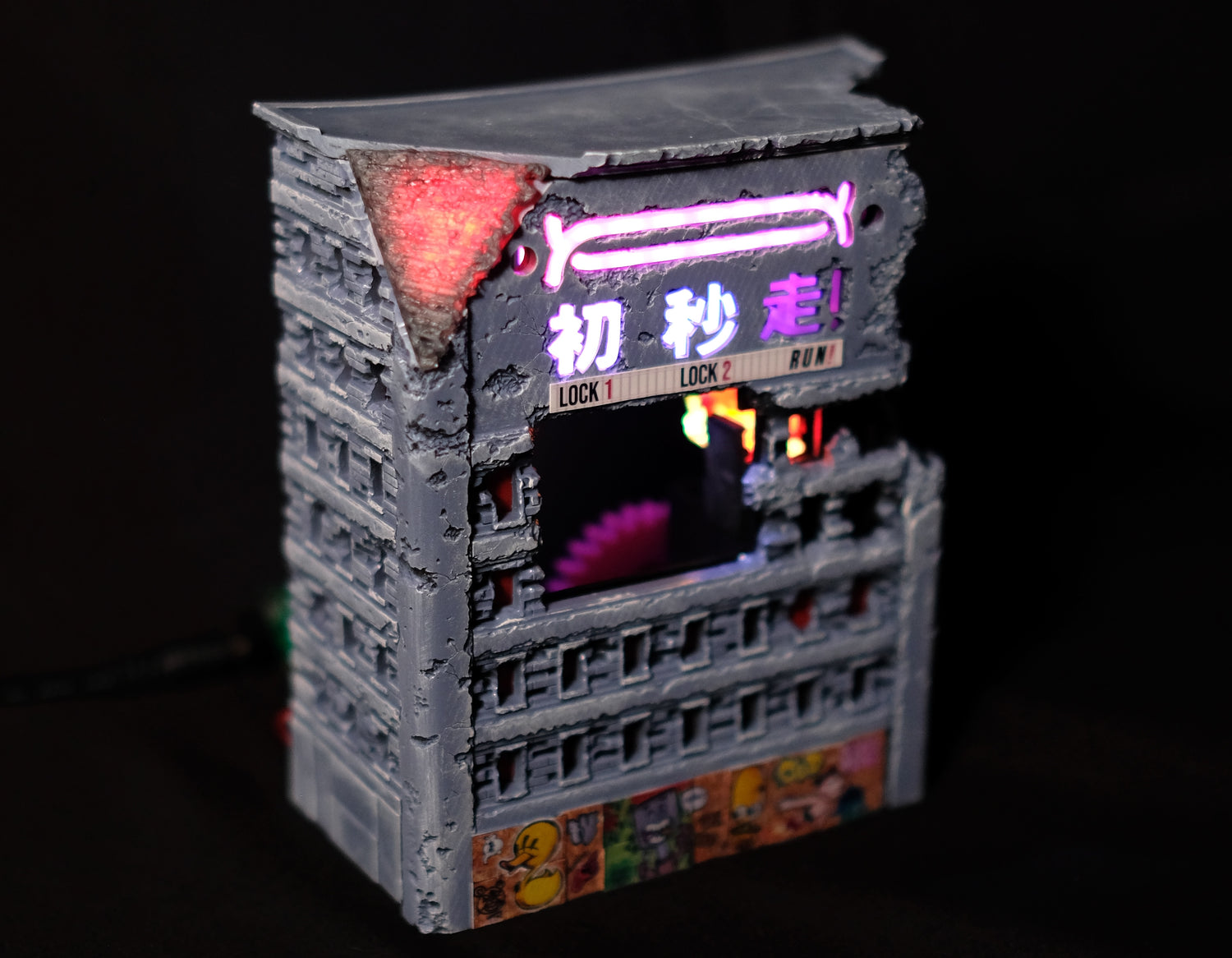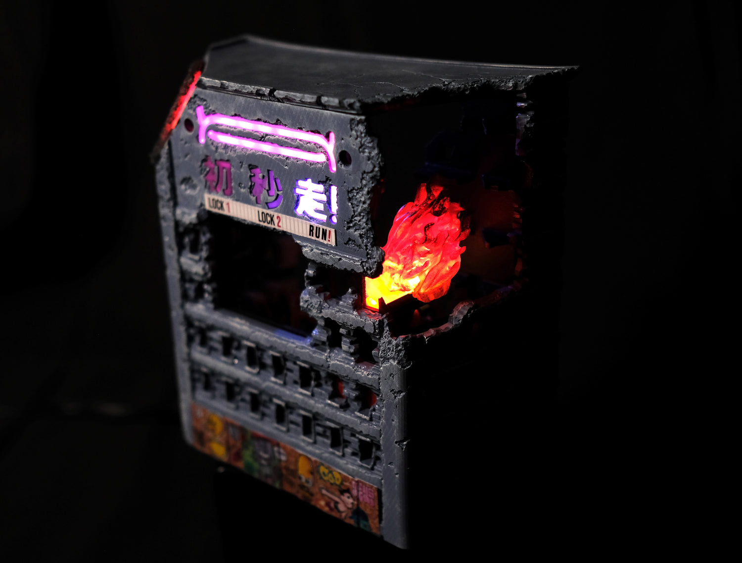 Also, you’ll be able to see some print lines in the collapsing wall section. This was again due to time constraints. We FDM printed it, but for production it will the usual quality, with some edge highlighting to make it stand out a bit more.