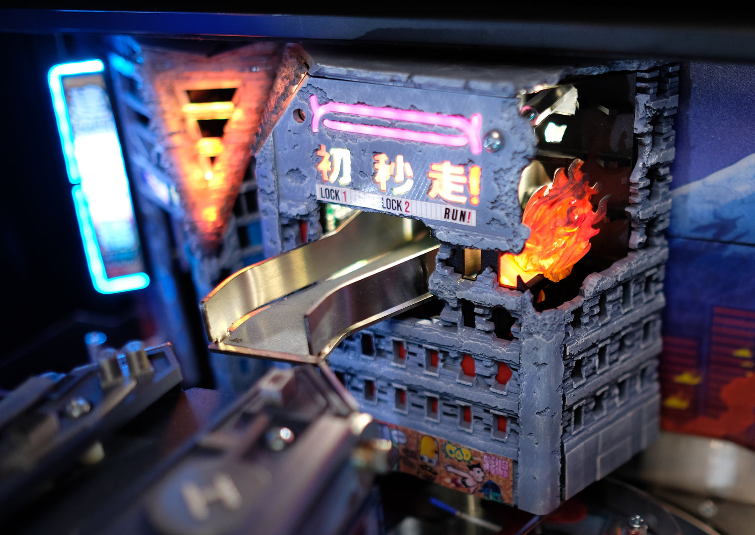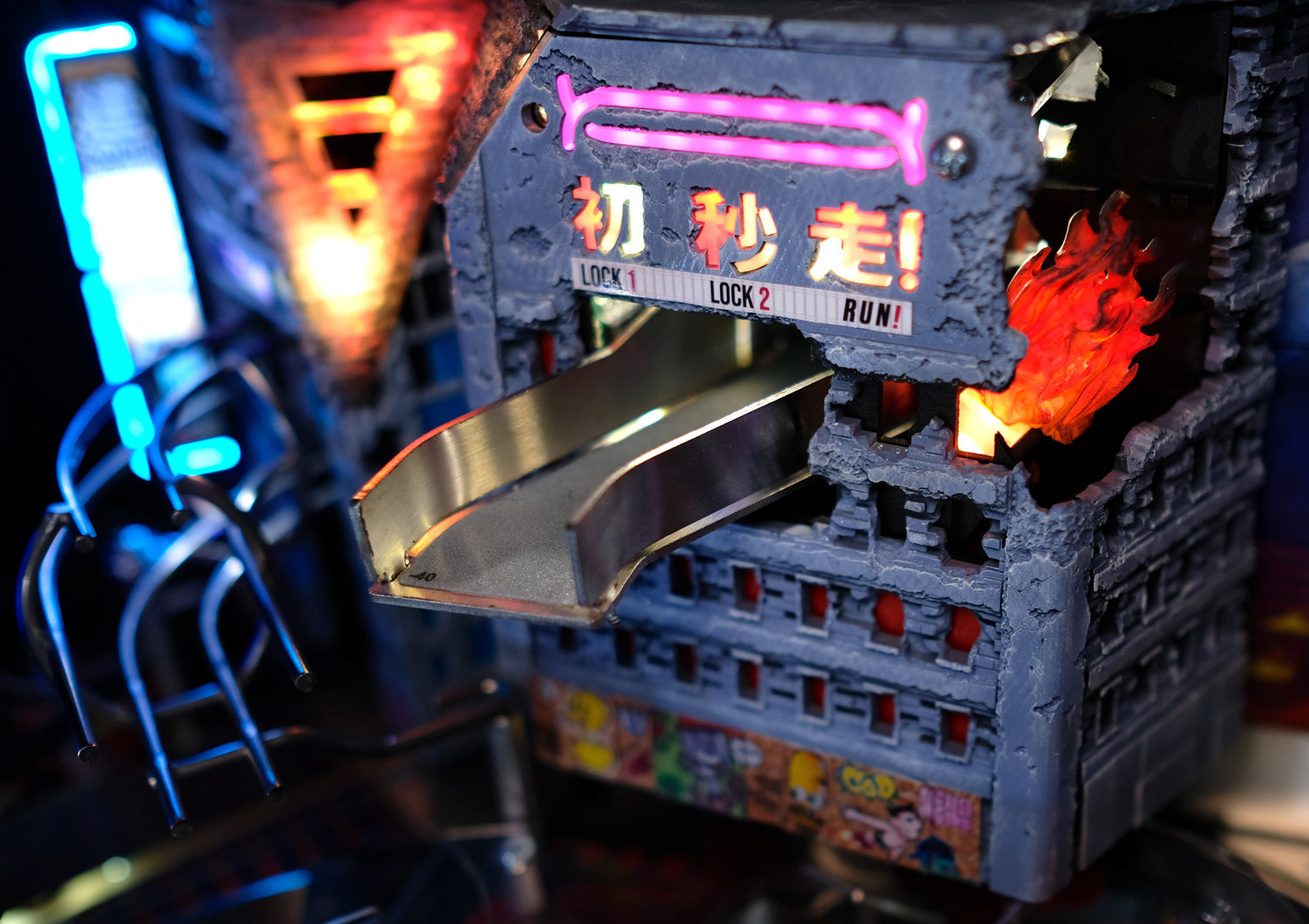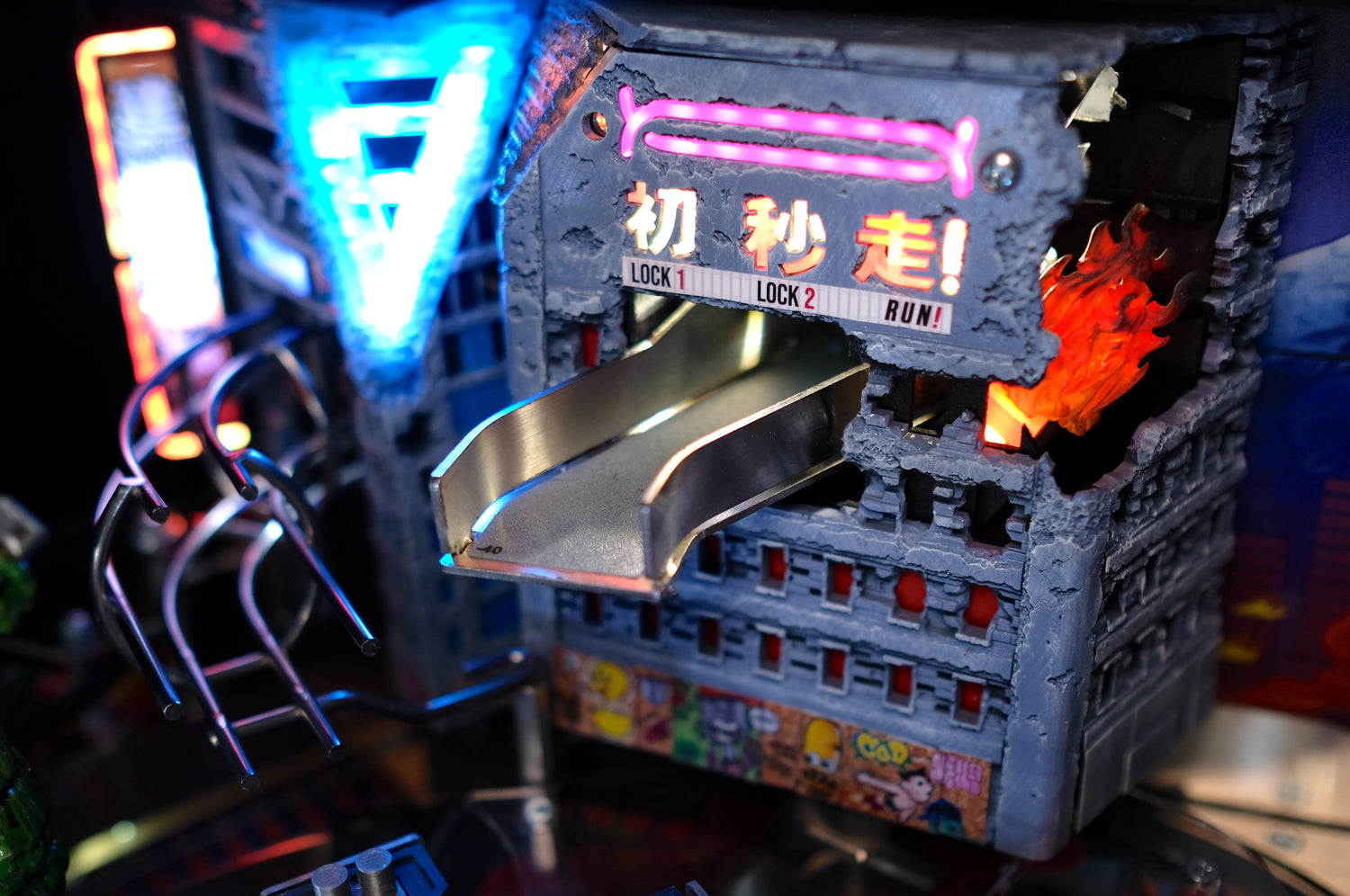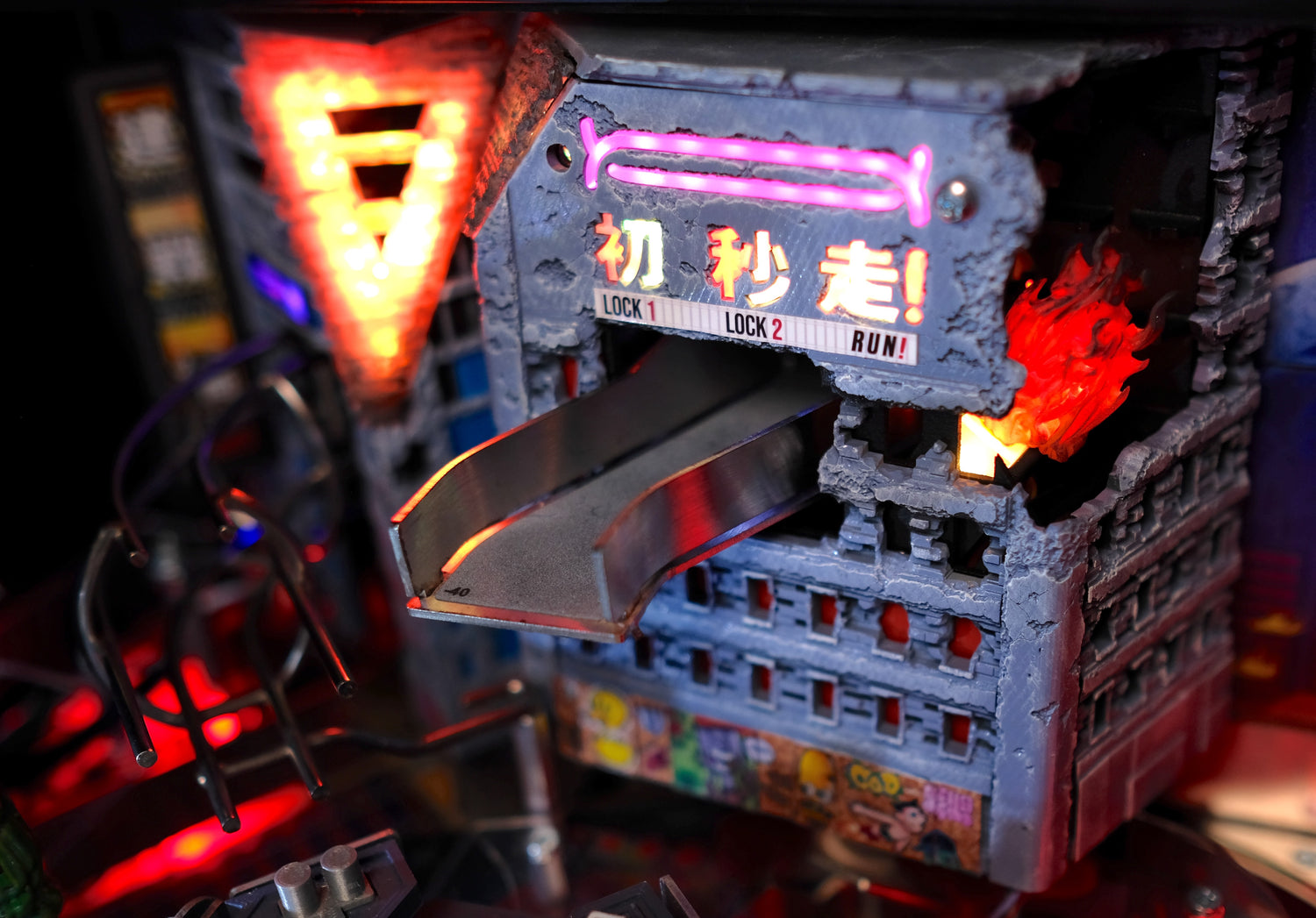 - Mechanically animated collapsing side wall, which triggers during multiball and reveals animated RGB fire underneath.